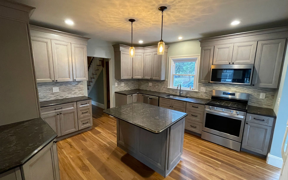 We Installed all new gray, stained Shaker-style cabinets w/ new counter-tops, and right down to the painting, we do it all. New under-mount sink, new backsplash tile and a good sized island for garbage pullout, plenty more cabinet space and stool seating for 2. The new refrigerator will come in at a later date.
